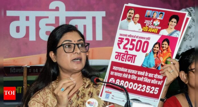 NEW DELHI: All India Mahila Congress chief Alka Lamba on Wednesday announced that women from deprived sections in Bihar will receive Rs 2,500 per month if the Mahagathbandhan alliance forms the next government in the state. The promise backs RJD leader Tejashwi Yadav’s ‘Mai Behan Maan’ scheme, first unveiled in February.Speaking at a press conference in Patna, Lamba criticised the NDA governments at the Centre and in Bihar, accusing them of neglecting women’s welfare. “The Congress and our Mahagathbandhan allies are committed to women’s empowerment. If we win the upcoming elections, Rs 2,500 per month will be directly transferred to eligible women by the state government,” she said, as per PTI.Lamba said the scheme will be implemented “immediately” after the alliance takes power, citing similar initiatives rolled out by Congress governments in Karnataka, Telangana, and Himachal Pradesh.To facilitate enrollment, party workers will distribute registration forms across the state. Additionally, a mobile number (8800023525) has been issued for women to register via missed call.Targeting the current Bihar administration, Lamba said, “The state is giving only Rs 400 to poor women, and even that is irregular. In rural Bihar, women are suffering, and crimes against them have gone up. Yet, the government remains a mute spectator.”Responding to questions on Tejashwi Yadav’s earlier announcement, Bihar Congress president Rajesh Ram clarified that ‘Mai Behan Maan’ is a joint Mahagathbandhan initiative. “It’s not a scheme of any one party. The decision was taken by our alliance’s coordination committee. All partners will work together to build voter awareness,” he said, as reported by PTI.Ram added that Congress was the first to implement this model in Karnataka and Himachal, and similar initiatives were run by the Mahagathbandhan government in Jharkhand.Reacting sharply to the announcement, BJP spokesperson Neeraj Kumar alleged that Mahagathbandhan parties are “fighting for credit” and “misleading voters.”In February, Tejashwi Yadav had promised Rs 2,500 per month to women if his party returned to power. He has also pledged 200 units of free electricity and LPG cylinders at Rs500, criticising Nitish Kumar’s leadership and accusing the government of corruption, unemployment and lawlessness.“The CM is tired. Retired officers are looting the treasury. Administrative anarchy prevails,” Yadav had said, adding that Bihar tops “all the wrong charts.”The announcement comes as political temperatures rise in the state ahead of the 2025 Assembly polls.