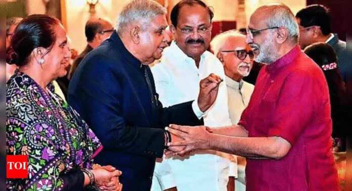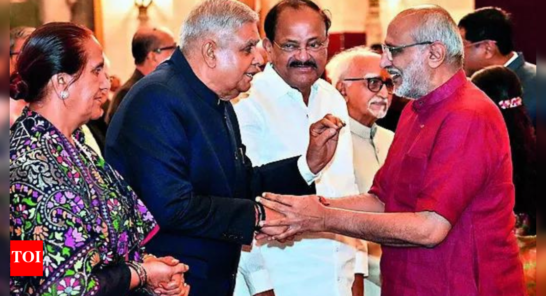 NEW DELHI: As PM Modi along with his ministerial colleagues gathered at the Rashtrapati Bhavan for the swearing-in ceremony of CP Radhakrishnan as the 15th Vice-President, the ceremonial hall buzzed with suspenseful anticipation — Will Jagdeep Dhankhar, the ex-VP, turn up? Dhankhar, who resigned on July 21 citing health concerns had not been seen publicly since. His absence fuelled rumours, with the opposition raising questions about his whereabouts. However, moments before the ceremony began, Dhankhar, accompanied by his wife, arrived, surprising many and silencing others.Dhankhar appeared to be relaxed. Smiling and looking jovial, the former VP also appeared to be healthier, engaging in lively conversations. Dhankhar was also seen walking up to home minister Amit Shah as the two exchanged “namastes”.He chatted with his predecessor Venkaiah Naidu and greeted MPs who approached him to exchange pleasantries. A senior MP, who attended the event, said Dhankhar exchanged pleasantries with others, and stayed for the customary high tea, a move that caught many off guard.