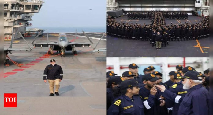 NEW DELHI: Prime Minister Narendra Modi marked this year’s Diwali in the company of India’s naval personnel, celebrating the festival aboard INS Vikrant off the coast of Goa and Karwar. Continuing his tradition of spending Diwali with the armed forces, the Prime Minister called it a “special Diwali on the seas” as he interacted with officers and sailors of the Indian Navy.PM Modi’s visit, undertaken discreetly from Delhi to Goa, included an extensive set of engagements onboard the indigenously built aircraft carrier. He toured the flight deck, surrounded by MiG-29K fighters, and witnessed an air power demonstration showcasing the jets’ day and night operations.