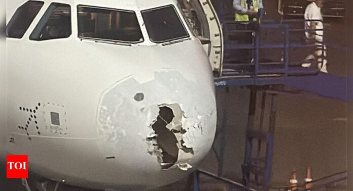NEW DELHI: An IndiGo flight, 6E 2142, winging its way atom Delhi to Srinagar on Wednesday evening encountered turbulence due to weather. The Airbus A321 (VT-IMD) had taken off from Delhi at 5 pm. About 45 minutes into the journey, it ran into bad weather and pilots reported the emergency to Srinagar ATC. The plane landed there safely at 6.46pm, according to flight tracking sites. It is learnt that everyone on board the aircraft is safe. The plane has been grounded at Srinagar.“IndiGo flight 6E 2142 operating from Delhi to Srinagar encountered sudden hailstorm en route. The flight and cabin crew followed established protocol and the aircraft landed safely in Srinagar. The airport team attended to the customers after arrival of the aircraft, prioritizing their wellbeing and comfort. The aircraft will be released post necessary inspection and maintenance,” the airlines said.