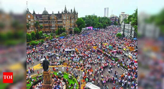 Mumbai: The hunger strike launched by Maratha quota activist Manoj Jarange at Azad Maidan, which brought Mumbai to a halt on Friday, is set to continue Saturday with the police extending permission for one more day. However, the largely peaceful protest is set to become more combative with Jarange accusing the govt of closing toilets and tea shops to deny food and water to activists food. He warned they will retaliate in equal measure and also attacked CM Fadnavis.“This is the final fight. Either the govt will kill me with bullets or I will die in the hunger strike,” said Jarange, whose agitation which demands Kunbi (OBC) status for the Maratha community comes shortly before local body polls due this year. Around 30,000 Maratha protesters converged in the city in a show of strength. Govt did not send a delegation to meet Jarange. However, earlier in the day, Fadnavis said, “We are supportive of the agitation because such agitations are a part of democracy. We are following court orders… A path has to emerge through talks.” The agitation will pit the Maratha community, said to number around 30% of the state’s population, against OBCs who are much larger in number. While NCP, Congress and NCP (SP) have a large Maratha following, OBCs are mainly with BJP. OBC groups have already announced a counter-agitation and this polarisation could benefit BJP.