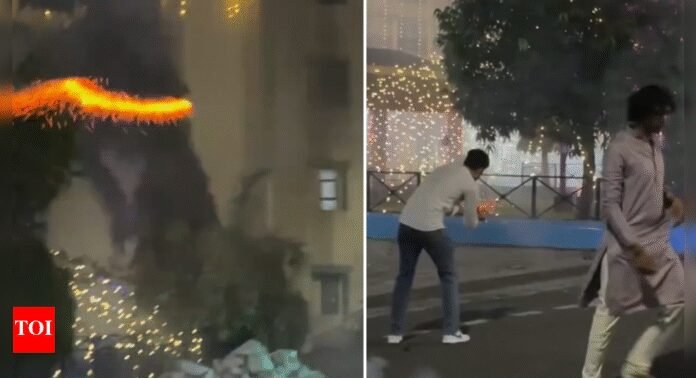NEW DELHI: A video circulating on social media captures a chaotic scene at IIT Guwahati, where a Diwali celebration turned into a fiery exchange of crackers between students. What began as festive fun quickly escalated into a dangerous “firecracker war” between residents of the Barak and Umiam hostels, forcing police to intervene.In the viral clip, students can be seen launching rockets and bursting crackers at each other from across hostel buildings, lighting up the campus sky in a chaotic display. The noise and intensity of the fireworks made the area resemble a battlefield more than a festival ground.