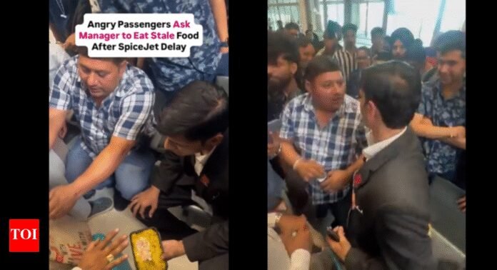NEW DELHI: A recent incident at Pune airport showed disgruntled passengers confronting a SpiceJet staff member over concerns about meal quality following a flight delay. The footage showed passengers insisting the ground staff consume the same food they received. The staff member is seen taking a bite whilst surrounded by the group. The recording, which surfaced on social media platform X through the account Woke Eminent, gained significant attention.The footage sparked diverse responses from social media users after it went viral.Whilst some sympathised with the travellers’ frustration, others commended the employee’s calm demeanour and criticised the passengers’ confrontational approach. “Staff is not responsible for the delay, so please show them some respect,” noted one viewer. “Salute to this staff, he was so humble,” stated another. “What is this sort of aggressive mob behaviour? Are you suggesting targeting one chap from the airline like this is acceptable conduct?” questioned a third observer.Additional comments included: “I salute that staff – so much patience. May God give him the best job; he deserves it.” Another supporter wrote, “Please ban these people… don’t harass the manager.”