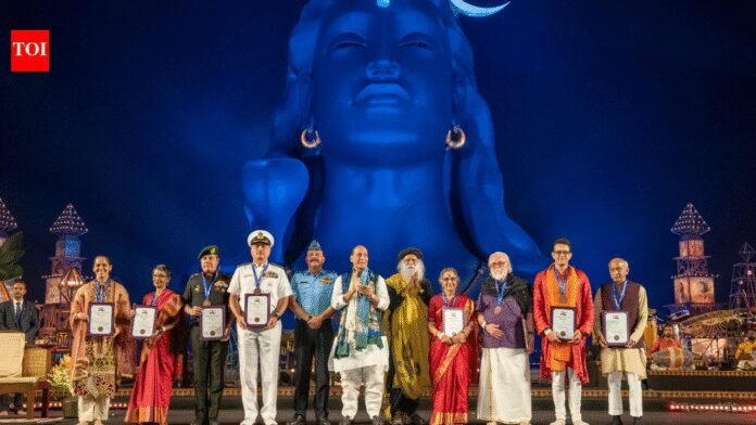 Spiritual leader Sadhguru Jaggi Vasudev on Sunday launched the ‘Bhavya Bharat Bhushan Award’ to recognise individuals for their contributions across national security, business, arts and entertainment, sports, community welfare, science and technology, and literature and academia.The award was presented during the Mahashivaratri celebrations, where defence minister Rajnath Singh attended the event as chief guest and honoured recipients from various fields.Among the awardees was noted violinist N Rajam, who said, “It is fantastic to get an award from Sadhguru ji. It is a big blessing and I have been connected with this ashram for many years. I have played in the Mahashivaratri festival for many years, I’ve played with my daughters and granddaughters.”Former Isro chairman S Kiran Kumar said the recognition was for the organisation’s decades of work. “It’s an award not given to me as an individual but I am a representative of an organization which over the last many decades has been serving to bring the space technology for the benefit of the country… I’m only a representative of this great organisation,” he told ANI.According to the Isha Foundation website, the Bhavya Bharat Bhushan Award is a national honour celebrating individuals whose work has significantly contributed to the nation’s growth and well-being.(With inputs from agencies)