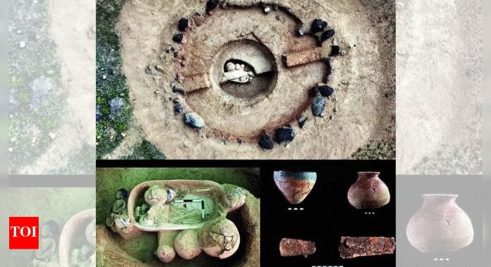 Smoke from a funeral pyre over 3,700 years ago left behind a trail of charcoal. That faint trace, sealed inside a terracotta sarcophagus buried in Kilnamandi village of Tiruvannamalai district, has now rewritten Tamil Nadu’s ancient past. Radiocarbon analysis in a US laboratory dated the deposit to 1692 BCE, placing this burial in the late Harappan age and hinting at trade links between southern India and regions as far away as Gujarat and Maharashtra.Burial offerings scattered around the stone coffin tell their own story. Etched carnelian beads, once prized in Harappan centres, lay beside graffiti-inscribed potsherds. “Carnelian beads were available in Maharashtra and Gujarat regions. So, it clearly establishes a trade contact with the north during the later Harappan period,” said K Rajan, professor and academic adviser to Tamil Nadu State Dept of Archaeology (TNSDA).Harappan or Indus Valley Civilization is generally dated between 3300 BCE and 1300 BCE. Rajan said the new dating also pushes TN’s graffiti tradition further back. “The grave goods contain graffiti-bearing pots, which indirectly places the date of the graffiti marks in TN to the 17th century BCE,” he said. Symbols carved onto the shoulders of the pots include fork-like shapes, semi-concentric circles in a U-formation, and vertical strokes with wavering lines superimposed.Excavators G Victor Gnanaraj and M Suresh said in their field report that some graffiti appeared restricted to specific burials, suggesting they could belong to members of the same clan.A larger study by Rajan and TNSDA joint director R Sivanandam examined 140 archaeological sites and found striking parallels between TN graffiti and markings at Indus Valley locations – nearly 90% shared similarities. “The AMS date of the sarcophagus gives authenticity to our study on graffiti marks,” Sivanandam said.Objects unearthed at Kilnamandi, including iron tools and pottery finds, add to the picture of a complex society. State archaeology minister Thangam Thennarasu released on Saturday this AMS-dating result, one among 139 scientific dates collated by the department, alongside preliminary excavation reports at Keeladi near Madurai.