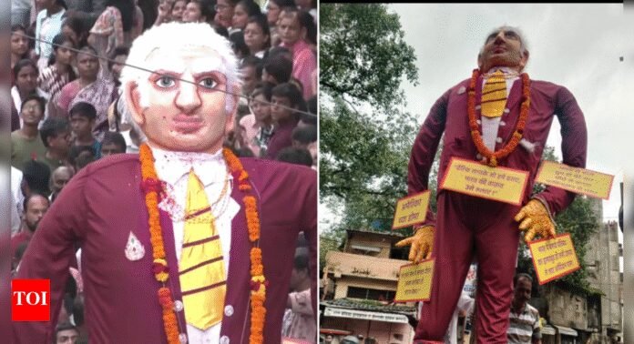 NEW DELHI: A giant effigy of US President Donald Trump was paraded through the streets of Nagpur on Saturday as part of the Marbat festival, with locals using the celebration to protest against the 50% tariffs recently imposed on Indian imports.Visuals from the procession showed residents chanting slogans, holding placards and wheeling the towering Trump figure through the city. “Tariff lagakar humein jo daraye, Bharat ki takat usse rulaye (Those who try to intimidate us with tariffs, India’s strength will make them weep),” read one placard. Another protester said, “The tariffs imposed on our goods will only ruin their business.”Some participants carried placards accusing Washington of hypocrisy, one of which read, “American uncle imposes restrictions on India, yet ends up taking Russian products itself.”The effigy, built with clay and hay, wore a dark red suit, white shirt and yellow tie, and was decorated with marigold garlands and posters. At one point, it was spun in circles and brought face to face with another effigy, drawing cheers from the crowd.The Marbat festival, which dates back to the late 1800s, is an annual Nagpur tradition where locals parade effigies to symbolically drive out evil and highlight contemporary political, social and economic issues. Over time, it has evolved into a blend of protest, satire and entertainment.Trump announced a 25% reciprocal tariff against India in early August after trade talks failed, followed by another 25% levy to be enforced later this month over India’s continued purchase of Russian oil during the Ukraine war. India has strongly opposed the measures, calling them “unfair, unjustified, and unreasonable,” while signalling it will maintain energy ties with Moscow.“If you have a problem with India buying oil or refined products from Russia, don’t buy from us. Nobody forces you. Europe buys, America buys, so if you don’t like it, don’t buy it,” India responded.(With inputs from agencies)